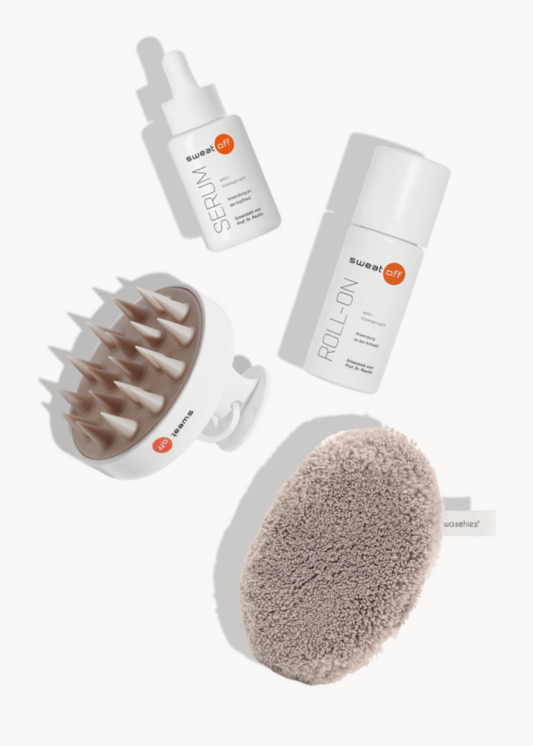 Das Sweat-Off Serum stoppt gezielt Kopfschwitzen, pflegt mit Panthenol und Biotin die Kopfhaut und lässt sich dank Pipette präzise auftragen. Der Sweat-Off Roll-On ist unser Bestseller gegen starkes Schwitzen: Er sorgt nachweislich für dauerhaft trockene Achseln und langanhaltenden Schutz vor Schweissgeruch.