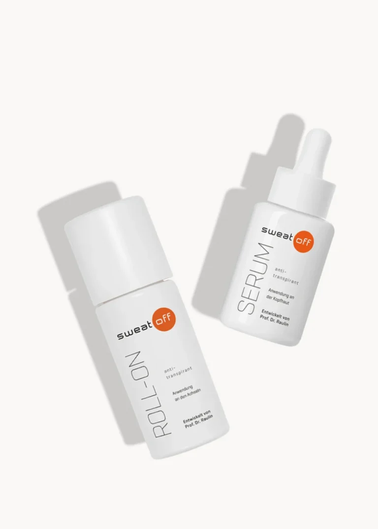 Durch seine spezielle Formel stoppt das Sweat-Off Serum Kopfschwitzen nachweislich und pflegt zusätzlich die Kopfhaut. Die Pipette erlaubt eine genaue Dosierung und ist ideal für die Anwendung auf der Kopfhaut. Der Sweat-Off Roll-On ist unsere erste Empfehlung gegen starkes Schwitzen. Verschiedene Untersuchungen belegen seine hohe Wirksamkeit und Hautverträglichkeit bei der Behandlung von Achselschweiss.