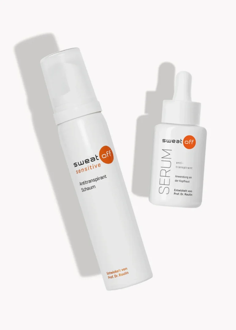 Unser Serum stoppt Kopfschwitzen gezielt. Die starke Anti-Schweiss-Wirkung wird ergänzt durch seine pflegenden Eigenschaften – es verbessert nachweislich die Hydration der Kopfhaut. Der Sweat-Off Schaum bietet dagegen Schutz vor Schweiss an grösseren Hautarealen, wie Nacken, Rücken, Brust, Oberschenkel, Gesäss oder Intimbereich. Er lässt sich leicht verteilen und zieht schnell ein. Seine einzigartige, schonende Rezeptur mit Laktatsalz macht ihn zur idealen Lösung für empfindliche Haut.