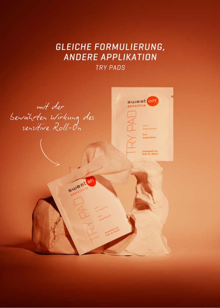 Die sensitive Try Pads eignen sich besonders für größere Körperflächen und setzen auf die bewährte Formulierung des Sweat-Off sensitive Roll-On. Damit kombinieren die Antitranspirant-Tücher eine hohe schweißhemmende Wirksamkeit mit nachweislich sehr guter Verträglichkeit – ideal für sensible Haut.